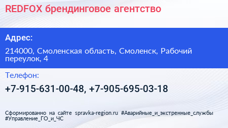 REDFOX, брендинговое агентство по адресу 214000, Смоленская область, Смоленск, Рабочий переулок, 4 в дальнейшем Организация, размещена в следующих категориях:
