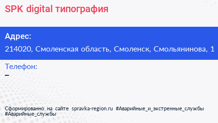 SPK-digital, типография по адресу 214020, Смоленская область, Смоленск, Смольянинова, 1 в дальнейшем Организация, размещена в следующих категориях: