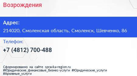 Возрождения по адресу 214020, Смоленская область, Смоленск, Шевченко, 86 в дальнейшем Организация, размещена в следующих категориях: