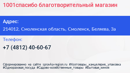 1001спасибо, благотворительный магазин по адресу 214012, Смоленская область, Смоленск, Беляева, 3а в дальнейшем Организация, размещена в следующих категориях: