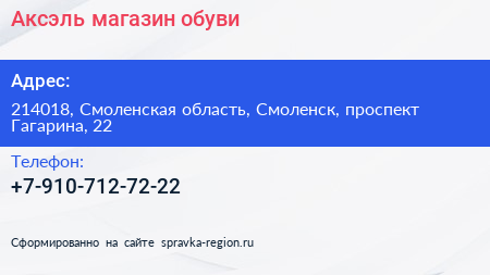 Аксэль, магазин обуви по адресу 214018, Смоленская область, Смоленск, проспект Гагарина, 22 в дальнейшем Организация, размещена в следующих категориях: