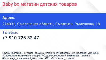 Baby bo, магазин детских товаров по адресу 214031, Смоленская область, Смоленск, Рыленкова, 18 в дальнейшем Организация, размещена в следующих категориях: