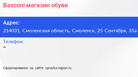 Basconi, магазин обуви по адресу 214031, Смоленская область, Смоленск, 25 Сентября, 35а в дальнейшем Организация, размещена в следующих категориях: