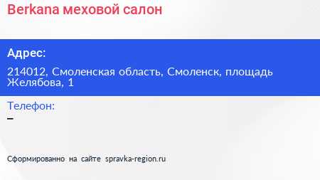 Berkana, меховой салон по адресу 214012, Смоленская область, Смоленск, площадь Желябова, 1 в дальнейшем Организация, размещена в следующих категориях: