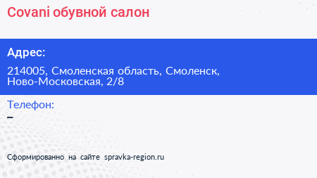 Covani, обувной салон по адресу 214005, Смоленская область, Смоленск, Ново-Московская, 2/8 в дальнейшем Организация, размещена в следующих категориях: