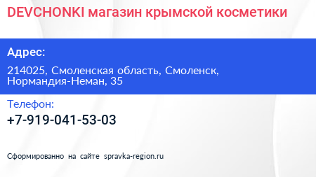DEVCHONKI, магазин крымской косметики по адресу 214025, Смоленская область, Смоленск, Нормандия-Неман, 35 в дальнейшем Организация, размещена в следующих категориях: