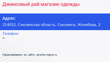 Джинсовый рай, магазин одежды по адресу 214012, Смоленская область, Смоленск, Желябова, 2 в дальнейшем Организация, размещена в следующих категориях: