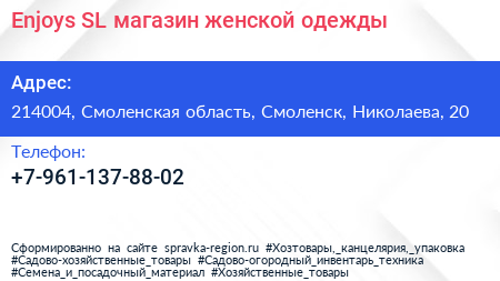 Enjoys SL, магазин женской одежды по адресу 214004, Смоленская область, Смоленск, Николаева, 20 в дальнейшем Организация, размещена в следующих категориях: