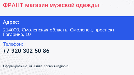 ФРАНТ, магазин мужской одежды по адресу 214000, Смоленская область, Смоленск, проспект Гагарина, 10 в дальнейшем Организация, размещена в следующих категориях: