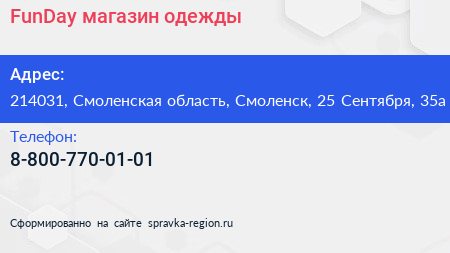 FunDay, магазин одежды по адресу 214031, Смоленская область, Смоленск, 25 Сентября, 35а в дальнейшем Организация, размещена в следующих категориях:
