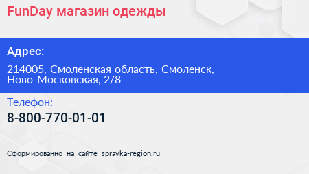 FunDay, магазин одежды по адресу 214005, Смоленская область, Смоленск, Ново-Московская, 2/8 в дальнейшем Организация, размещена в следующих категориях: