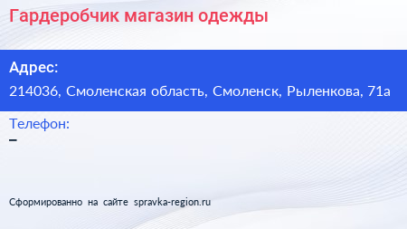 Гардеробчик, магазин одежды по адресу 214036, Смоленская область, Смоленск, Рыленкова, 71а в дальнейшем Организация, размещена в следующих категориях: