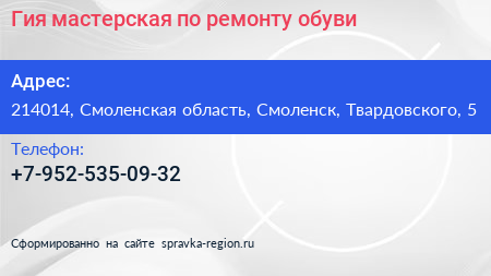 Гия, мастерская по ремонту обуви по адресу 214014, Смоленская область, Смоленск, Твардовского, 5 в дальнейшем Организация, размещена в следующих категориях: