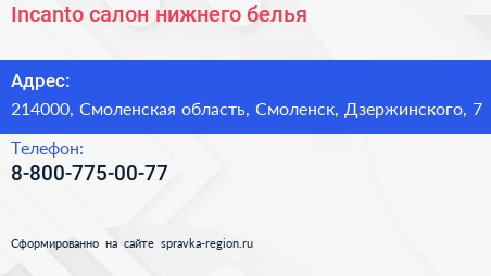 Incanto, салон нижнего белья по адресу 214000, Смоленская область, Смоленск, Дзержинского, 7 в дальнейшем Организация, размещена в следующих категориях: