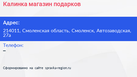 Калинка, магазин подарков по адресу 214011, Смоленская область, Смоленск, Автозаводская, 27а в дальнейшем Организация, размещена в следующих категориях: