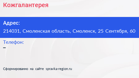 Кожгалантерея по адресу 214031, Смоленская область, Смоленск, 25 Сентября, 60 в дальнейшем Организация, размещена в следующих категориях: