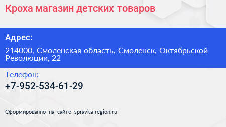 Кроха, магазин детских товаров по адресу 214000, Смоленская область, Смоленск, Октябрьской Революции, 22 в дальнейшем Организация, размещена в следующих категориях: