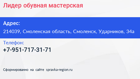 Лидер, обувная мастерская по адресу 214039, Смоленская область, Смоленск, Ударников, 34а в дальнейшем Организация, размещена в следующих категориях: