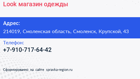 Look, магазин одежды по адресу 214019, Смоленская область, Смоленск, Крупской, 43 в дальнейшем Организация, размещена в следующих категориях: