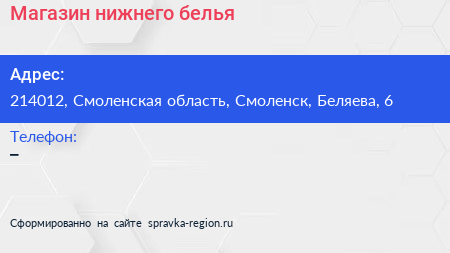 Магазин нижнего белья по адресу 214012, Смоленская область, Смоленск, Беляева, 6 в дальнейшем Организация, размещена в следующих категориях: