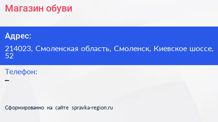 Магазин обуви по адресу 214023, Смоленская область, Смоленск, Киевское шоссе, 52 в дальнейшем Организация, размещена в следующих категориях: