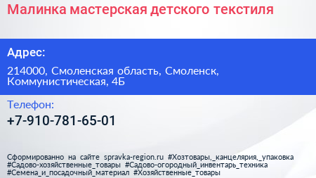 Малинка, мастерская детского текстиля по адресу 214000, Смоленская область, Смоленск, Коммунистическая, 4Б в дальнейшем Организация, размещена в следующих категориях: