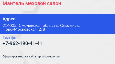 Мантель, меховой салон по адресу 214005, Смоленская область, Смоленск, Ново-Московская, 2/8 в дальнейшем Организация, размещена в следующих категориях:
