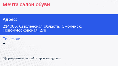 Мечта, салон обуви по адресу 214005, Смоленская область, Смоленск, Ново-Московская, 2/8 в дальнейшем Организация, размещена в следующих категориях: