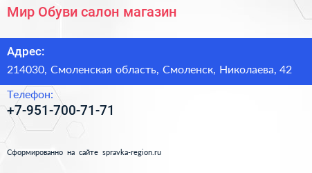 Мир Обуви, салон-магазин по адресу 214030, Смоленская область, Смоленск, Николаева, 42 в дальнейшем Организация, размещена в следующих категориях: