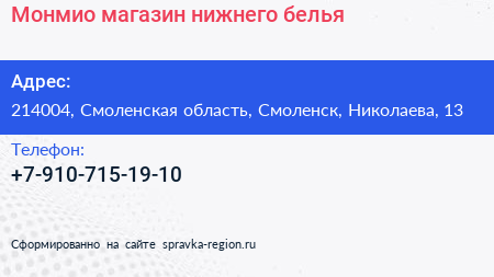 Монмио, магазин нижнего белья по адресу 214004, Смоленская область, Смоленск, Николаева, 13 в дальнейшем Организация, размещена в следующих категориях: