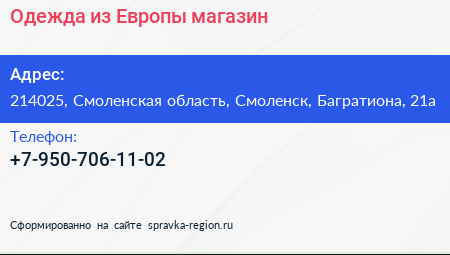 Одежда из Европы, магазин по адресу 214025, Смоленская область, Смоленск, Багратиона, 21а в дальнейшем Организация, размещена в следующих категориях: