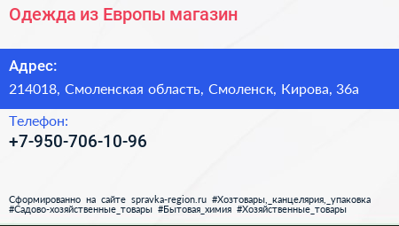 Одежда из Европы, магазин по адресу 214018, Смоленская область, Смоленск, Кирова, 36а в дальнейшем Организация, размещена в следующих категориях: