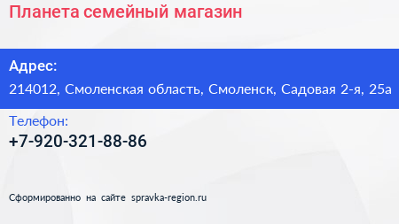 Планета, семейный магазин по адресу 214012, Смоленская область, Смоленск, Садовая 2-я, 25а в дальнейшем Организация, размещена в следующих категориях: