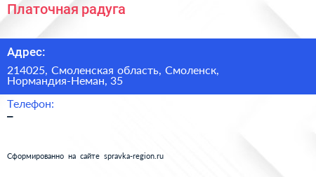 Платочная радуга по адресу 214025, Смоленская область, Смоленск, Нормандия-Неман, 35 в дальнейшем Организация, размещена в следующих категориях: