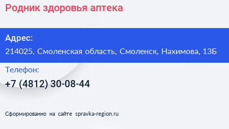 Родник здоровья, аптека по адресу 214025, Смоленская область, Смоленск, Нахимова, 13Б в дальнейшем Организация, размещена в следующих категориях:
