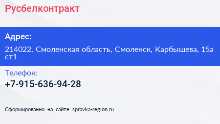 Русбелконтракт по адресу 214022, Смоленская область, Смоленск, Карбышева, 15а ст1 в дальнейшем Организация, размещена в следующих категориях: