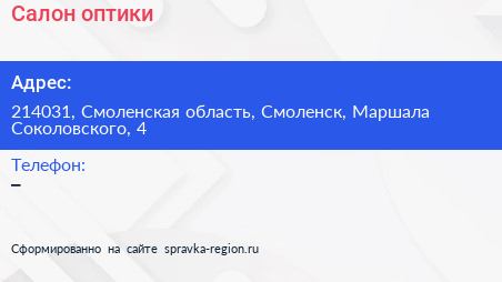 Салон оптики по адресу 214031, Смоленская область, Смоленск, Маршала Соколовского, 4 в дальнейшем Организация, размещена в следующих категориях: