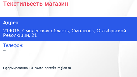 Текстильсеть, магазин по адресу 214018, Смоленская область, Смоленск, Октябрьской Революции, 21 в дальнейшем Организация, размещена в следующих категориях: