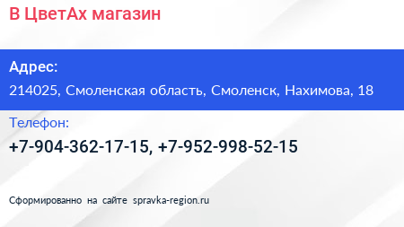 В ЦветАх, магазин по адресу 214025, Смоленская область, Смоленск, Нахимова, 18 в дальнейшем Организация, размещена в следующих категориях: