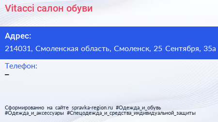 Vitacci, салон обуви по адресу 214031, Смоленская область, Смоленск, 25 Сентября, 35а в дальнейшем Организация, размещена в следующих категориях: