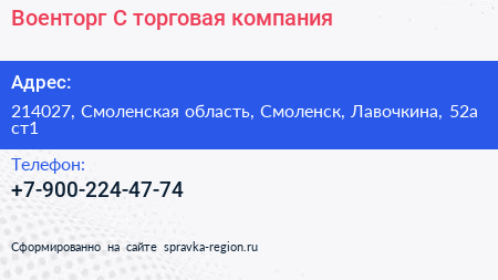 Военторг-С, торговая компания по адресу 214027, Смоленская область, Смоленск, Лавочкина, 52а ст1 в дальнейшем Организация, размещена в следующих категориях: