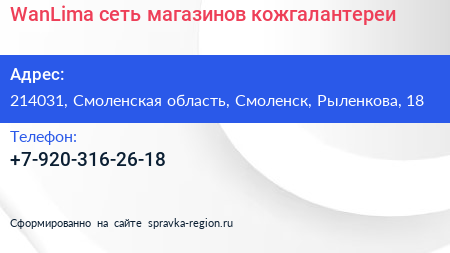 WanLima, сеть магазинов кожгалантереи по адресу 214031, Смоленская область, Смоленск, Рыленкова, 18 в дальнейшем Организация, размещена в следующих категориях: