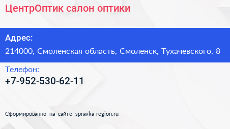 ЦентрОптик, салон оптики по адресу 214000, Смоленская область, Смоленск, Тухачевского, 8 в дальнейшем Организация, размещена в следующих категориях: