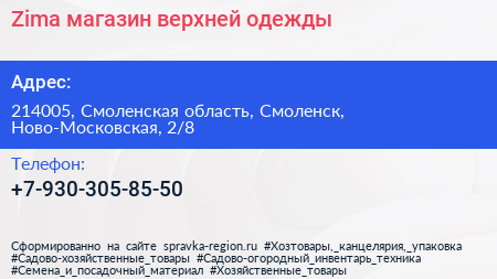Zima, магазин верхней одежды по адресу 214005, Смоленская область, Смоленск, Ново-Московская, 2/8 в дальнейшем Организация, размещена в следующих категориях: