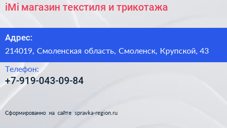 iMi, магазин текстиля и трикотажа по адресу 214019, Смоленская область, Смоленск, Крупской, 43 в дальнейшем Организация, размещена в следующих категориях: