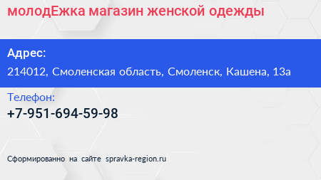 молодЕжка, магазин женской одежды по адресу 214012, Смоленская область, Смоленск, Кашена, 13а в дальнейшем Организация, размещена в следующих категориях: