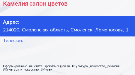 Камелия, салон цветов по адресу 214020, Смоленская область, Смоленск, Ломоносова, 1 в дальнейшем Организация, размещена в следующих категориях: