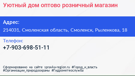 Уютный дом, оптово-розничный магазин по адресу 214031, Смоленская область, Смоленск, Рыленкова, 18 в дальнейшем Организация, размещена в следующих категориях: