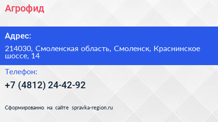 Агрофид по адресу 214030, Смоленская область, Смоленск, Краснинское шоссе, 14 в дальнейшем Организация, размещена в следующих категориях: