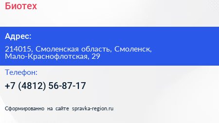 Биотех по адресу 214015, Смоленская область, Смоленск, Мало-Краснофлотская, 29 в дальнейшем Организация, размещена в следующих категориях: